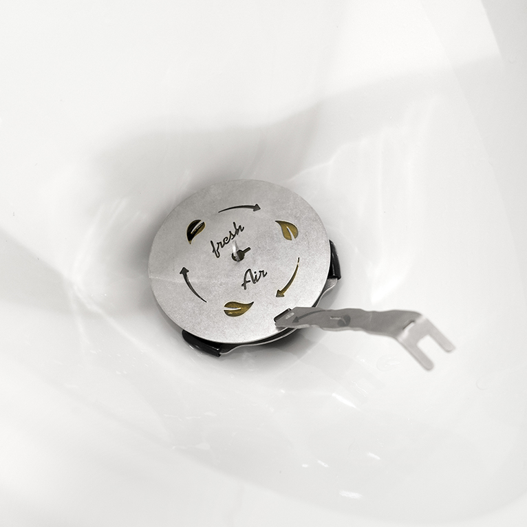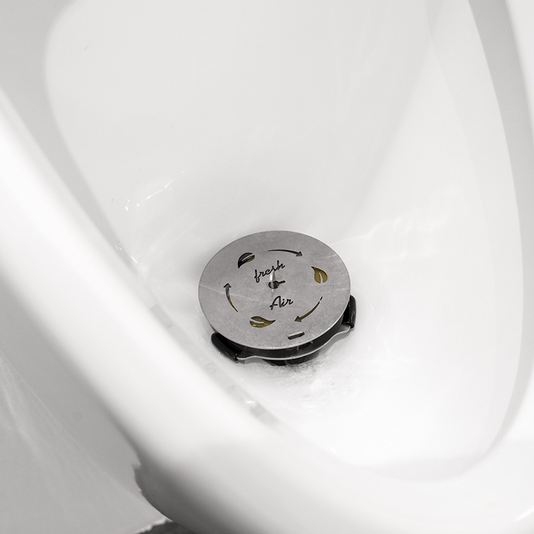 Das Urinalsteinreinigungssystem „Frische-Puck“ beseitigt üble Gerüche und minimiert die Bildung des Abflussrohr zusetzenden Urinsteins.