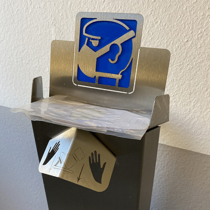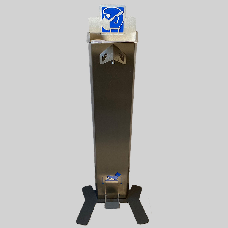 Die Hygienesäule von BBM überzeugt durch ihr modernes Design und die hochwertige Verarbeitung der Materialien. Sie bietet Platz für Einwegmasken und Desinfektionsspender. Das Desinfektionsmittel wird durch betätigen der Fußpumpe auf die Hände gesprüht.