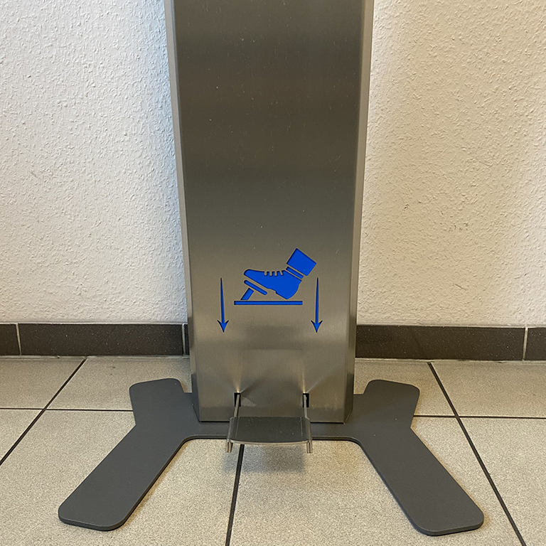 Durch ihre Höhe von circa 138 cm ermöglicht die Desinfektionssäule eine komfortable, einfache Bedienung. Der Hygienespender kann ohne Strom und Batterien betrieben werden. Um einen sicheren Stand zu gewährleisten und den Untergrund vor Kratzern zu bewahren, sind große Filzgleiter am Fuß des Spenders angebracht.